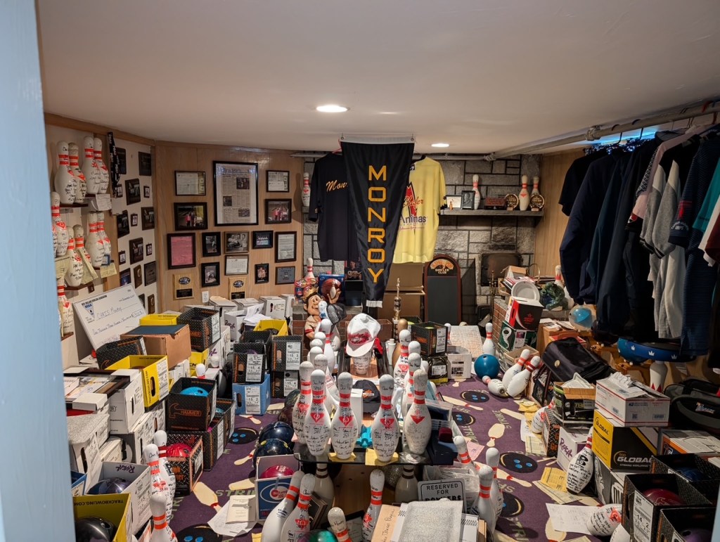 I don’t know who asked him but my youngest said “Daddy, do you have a PBA title?” And I said “Yes I do, that’s what that big black banner is down in my Trophy Room” [see above photo]. I don’t want my kids to be “Brag-a-docious” if you know what I mean, but at the end of the day if anyone asks was Chris Monroy was your Daddy, they can say “Yeah he was.” And bowling gives me the ability someday when I’ m no longer here, to have something they can hold on to and say, yeah he was my daddy. They have something from me.